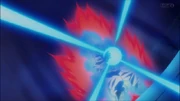 During the Tournament of Destroyers in the anime, Goku uses the 10x God Kamehameha against Hit to finish him off, as he could not withstand the stress of Kaio-ken in sync with a new transformation, Super Saiyan Blue. Goku used the Kamehameha against Hit then flew in the blast in an attempt to punch Hit. Hit used his Pure Progress to increase his Time-Skip and froze Goku and his Kamehameha blast in time enough for Hit to dodge.